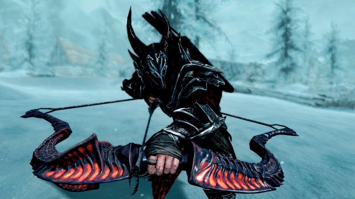 Внешне форма лука довольно необычная, но он неплохо подходит к даэдрической кольчуге.