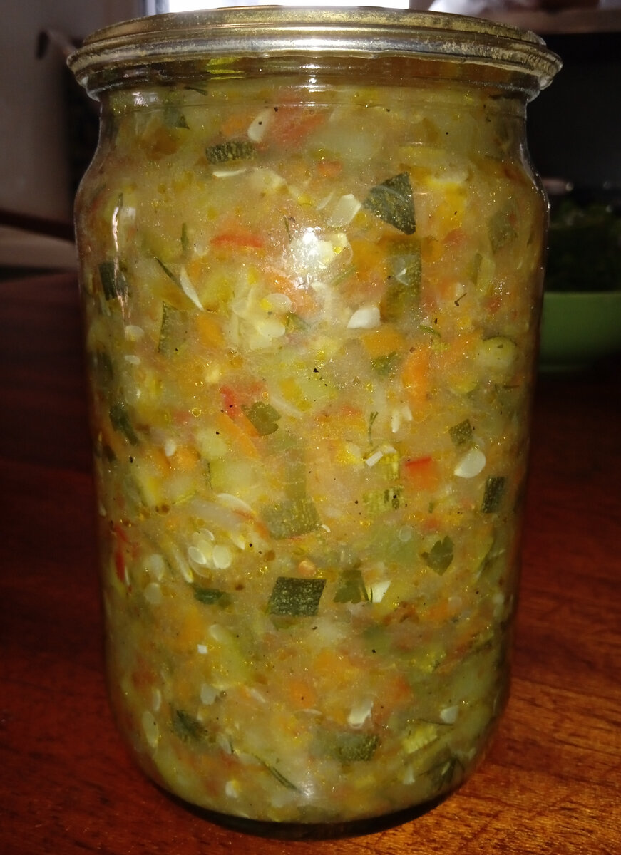 Ингредиенты: кабачки 3 кг, морковь 0,5 кг, лук репчатый 0,5 кг, перец болгарский 0,5 кг, масло растительное 200 гр, сахар 3 столовых ложки, соль 2 столовых ложки, уксусная эссенция 1 столовая ложка, перец чёрный и красный молотый, чеснок 1 головка, зелень петрушки, укропа, кинзы, базилика, вода 1 литр, томат домашний 200 гр. Овощи перемыть, почистить. Кабачки нарезать кубиками. Морковь натереть на крупной терке, лук и болгарский перец нарезать полукольцами. В большую кастрюлю ( у меня семи литровая) налить 200 гр растительного масла. В кипящее масло высыпать морковь, лук, болгарский перец по очереди с интервалом в несколько минут, чтобы они немного обжарились. Когда высыпаем перец, овощи начинают тушиться. Тушим, пока они не станут мягкими. Добавляем кабачки и воду, соль и сахар, перемешиваем и варим минут 30, до готовности кабачков. Пока варятся кабачки, моем и стерилизуем банки. Добавляем томат. Измельчаем зелень и чеснок. Добавляем зелень, чеснок и уксусную эссенцию. Тщательно