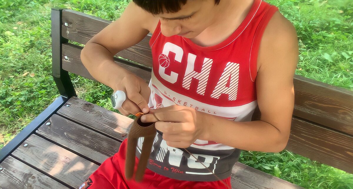 Однажды я заметила, что Кирилл достал из ящика со старыми вещами спицы и сидит в кресле вяжет. Я вспомнила, как года три назад показывала детям как вязать лицевыми петлями (всё, что я умею) и тогда никто особо не увлёкся, а Кирилл быстро научился и вязал себе какие-то напульсники.. И вот теперь снова от скуки сидит и вяжет какие-то полоски бесцельно.