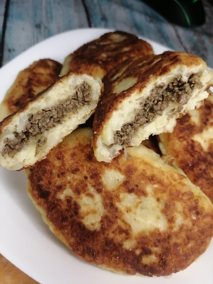 Получилось вкусно. Вообще хотела наделать орских пирожков. Начинка именно для них. Но не захотелось возиться с тестом. Решила так попробовать. Для начинки: ✔️Куриные сердечки и печень примерно по 300 гр. Можно ещё жалудки. ✔️2 луковицы ✔️Соль, перец. Сердечки и печень помыть и перемолоть (сырыми). Выложить на сковородку и тушить минут 20, пока не выпарится жидкость. Добавить немного растительного масла, соль, перец. И слегка обжарить. Лук перемолоть и добавить к горячей начинке(снять с огня). Дать остыть. Для теста: ✔️Примерно 2 кг картошки сварить в мундире, почистить. И натереть на крупной терке. ✔️Добавить 2-3 яйца ✔️Посолить и поперчить ✔️Всыпать 4-5 ст. л. муки Всё хорошо перемешать. И сразу лепить зразы. Лепить присыпая и стол и руки мукой. Жарить на растительном масле до золотистого цвета. P. S. На мой взгляд, с тестом было бы проще. Ну а если хочется заморочиться, то вполне имеет смысл. Пробуйте, подписывайтесь❤️❤️❤️! Будет ещё много вкусностей! 👋