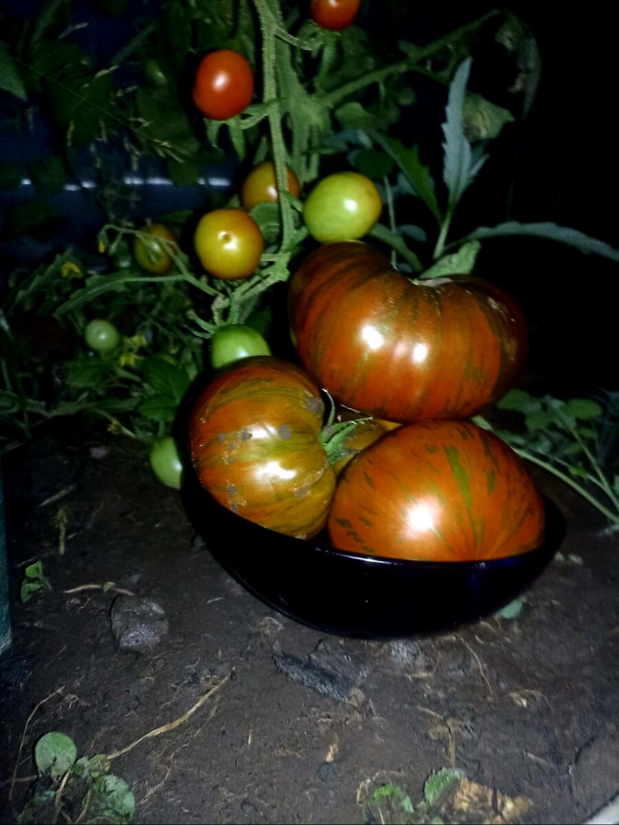 У меня уродились помидоры! Такие вот рыже-буро-зелёно-полосатые! Что за сорт не знаю. Они- подкидыши. В этом году все мои помидоры отданы мне знакомыми. Ну...и честно, не скажу что все были в восторге. Помидоры осознавали в чьи руки они попали, а я знала что не особо будет мне до помидор. Я вообще, если честно, не понимаю всех этих огородных переживаний: ах, не растёт капуста/ помидоры/ огурцы/ итд, итп. Ой, я наверное не подкормила/ перекормила/ перелила/ не полила/ не тем полила. У меня принцип простой: посадила и расти. Нет, я, конечно, и порыхлю и позабочусь и полью чем-нибудь типа "готовое удобрение для помидор и сладкого перца", но без фанатизма. Не растут? Да и фиг с ними, переживу. Дочь моя третий год покупает клубни батата и сажает. И переживает, что они плохо растут. А я воткнула тыкву, мне сказали:" Тыква для слабаков." Как ни странно, при таком, местами пофигистском отношении, у меня все растет и относительно неплохо. Но очень я люблю вечерком, после полива, посидеть на по