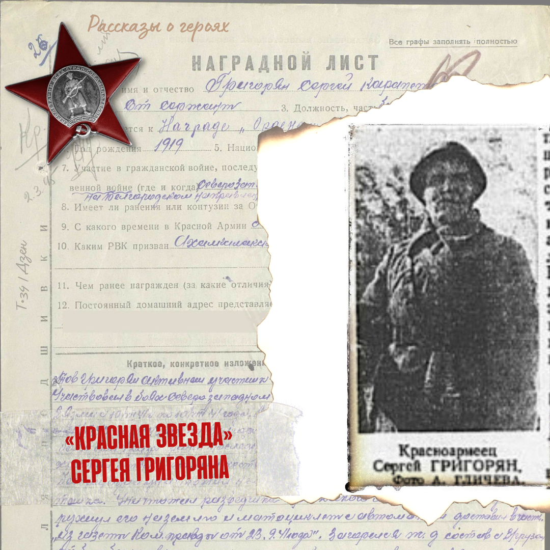 Григорян Сергей (Серго) Карапетович родился в 1919 году в селе Бежано Ахалкалакского района Грузии. Комсомолец. В Красной Армии с 23 сентября 1939 года. Воевал с 22 июня 1941 года в составе 4-й гвардейской стрелковой дивизии на Северо-Западном и Ленинградском направлениях, участвовал в обороне Сталинграда. Осенью 1941 года совершил ряд подвигов, о которых «Комсомольская правда» рассказала 28 сентября 1941 года в заметке «Младший брат Давида Сасунского». «Младший брат Давида Сасунского» — так шутя называет комиссар Н-ской части бойца-комсомольца Сергея Григоряна. В этой шутке есть большой смысл. Высокий, атлетически сложенный юноша Сергей Григорян бесстрашно и мужественно защищает родную землю от нашествия фашистских варваров. В жестоком бою на одном из участков Северо-Западного фронта вражеская пуля повредила винтовку Сергея Григоряна. Григорян не вышел из боя. Выхватив из-за пояса саперный топор, он пошел на врага. Поблизости от смелого комсомольца остановился фашистский танк. Cергей