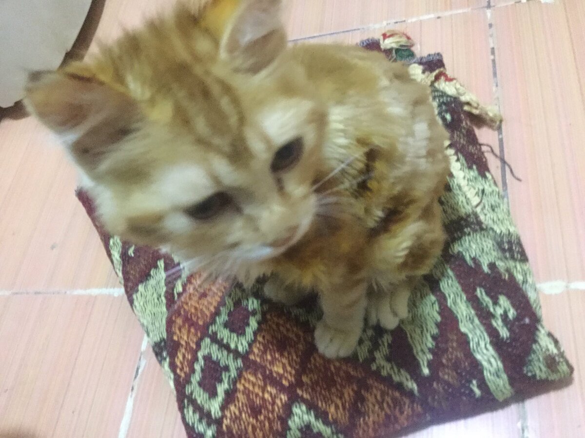 Как-то я забрела на дорогу возле мусульманского кладбища. Очень грязное и ужасное место, много мусорных баков, в которых копошились несчастные кошки. Я стала насыпать им вискас и заметила в стороне маленького пушистого котенка. Стала кормить его отдельно, чтобы взрослые коты не отняли еду. Но котёнок отказывался есть. Когда заметил, что собираюсь уходить, на своих маленьких слабых ножках поковылял за мной. Он не мяукал, только всхлипывал, тяжело вздыхал и голосом как-то странно скрипел. Котик был очень слабый. Бросить его на улице означало оставить на верную гибель. Взяла его с собой, подумав, что сначала нужно спасти, а потом уже решу, что с ним делать. Раздам кому-то возможно. После побега первого кота я так наплакалась, скучала нему и переживала, что решила больше никогда-никогда не возьму кошку. Тяжело её потерять, сложно за ней ухаживать, на балконе на перилы залезает, того и гляди свалится, разобьется, упадёт кому-то на голову. И вообще у меня аллергия на котов.