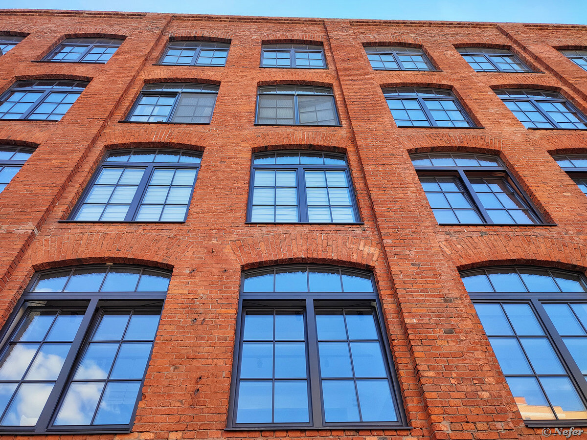 Стиль лофт нынче очень популярен. Выглядит стильно, свободная планировка, высокие потолки. Обычно это реконструированные исторические здания. В этом корпусе был склад. Теперь это жилой комплекс, который назван в честь легендарного поезда Москва — Санкт-Петербург. Вы уже поняли, в чем подвох? Это бывшая территория промзоны № 16 "Митьковская ветка": концерн "Бабаевский", отстойно-ремонтный корпус электродепо "Северное", вот это вот все. В 2008 году она реорганизована. С тех пор все очень изменилось. За краснокирпичный склад взялась команда, которая занималась реконструкцией завода "Флакон" и Хлебозавода № 9. Были демонтированы стихийные пристройки, с фасада сняты кондиционеры, замены оконные рамы, проведен капитальный ремонт здания. До реконструкции этот домик был покрыт унылым сайдингом. Теперь вместо него деревянная дранка. Судя по вывеске помещение занимает корейская школа. Вообще, все очень красиво. Просторный двор, галерея, салон красоты, кофейня, пекарня, винотека и другие магазины