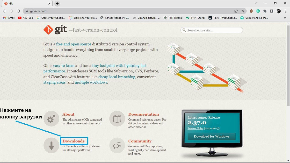 Чтобы использовать Git, его необходимо загрузить на свой компьютер. Сделать это можно, зайдя на официальный сайт.