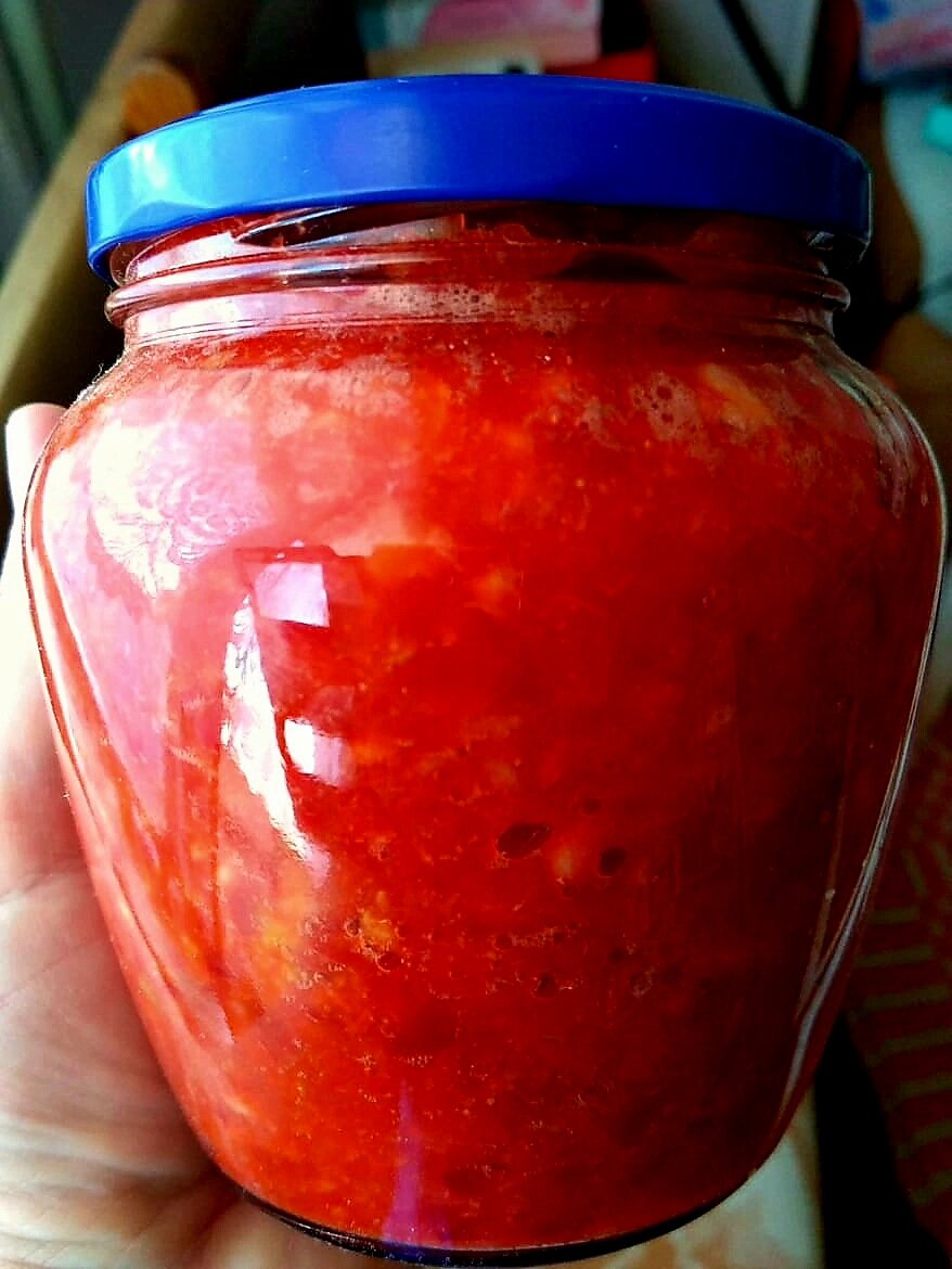 Острый аджичный соус без варки. Он же - сырая аджика, с яблоками. Можно закатать на зиму.