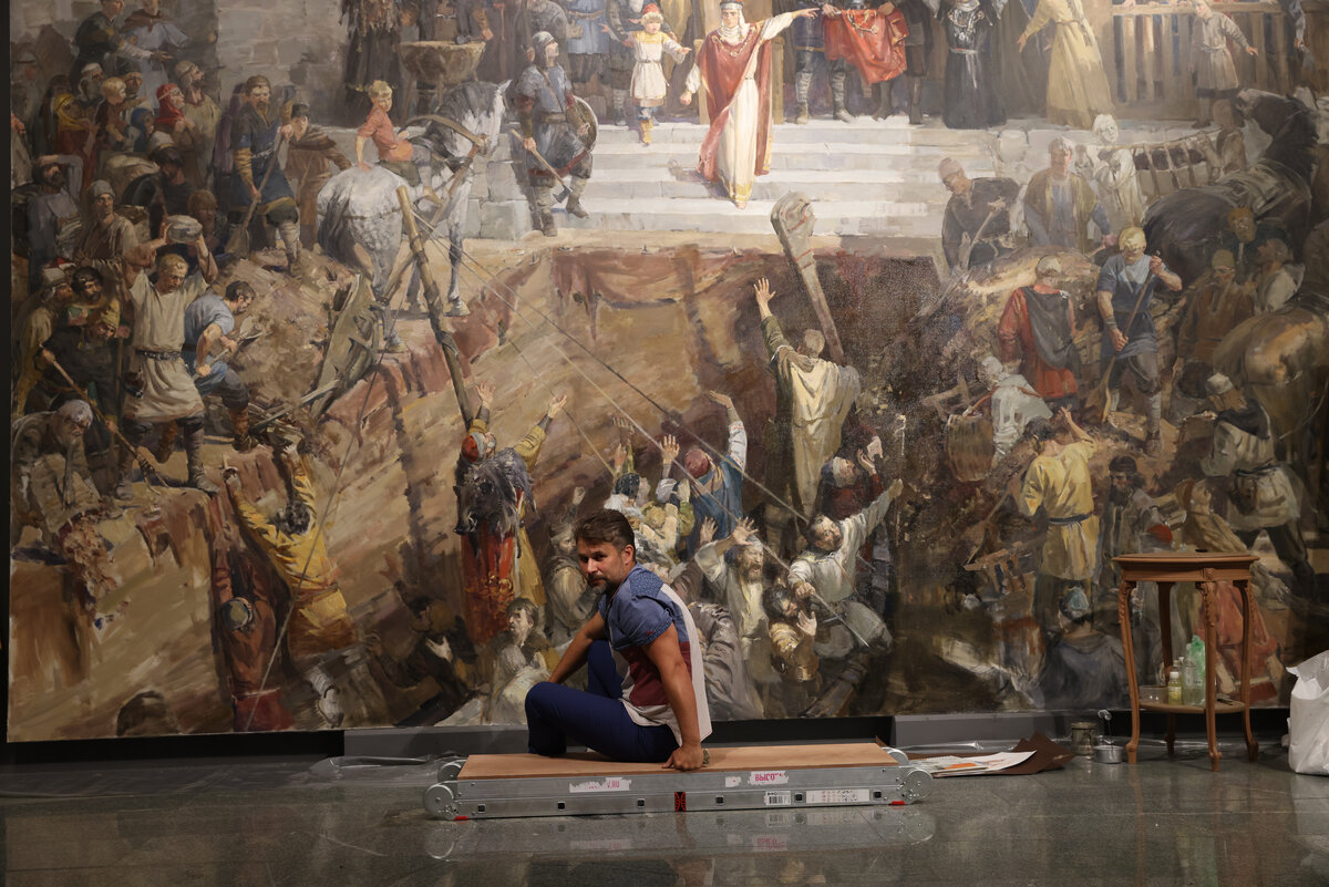 4 августа в Музее Победы художник Григорий Гукасов приступил к работе над завершением монументального полотна «Княгиня Ольга». Незаконченная картина была представлена на художественной выставке «Мы от рода русского», которая открылась 13 июля. Об этом сообщает редакции РНЛ Информационный центр Музея Победы. Художник академической школы, Гукасов создает монументальные полотна в историческом жанре. Большое внимание он уделяет композиции, выразительной пластике и общему колористическому решению. Обладая узнаваемым живописным стилем, его работы близки к традициям русской классической живописи. Именно таким является и полотно «Княгиня Ольга». Картина посвящена первой женщине, правившей на Руси. В основу картины лег один из эпизодов «Повести временных лет» - месть княгини за вероломное убийство древлянами ее мужа киевского князя Игоря. Зрители увидят княжеский двор, свиту Ольги и посланников древлян, которых сбросили с глубокую яму в их же собственной ладье. Зрителям выпал уникальный шанс ув