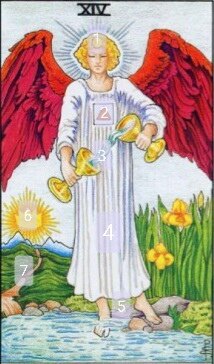 #таро Символика: 1. Круг и точка посредине - символ Солнца. 2. Треугольник в круге - божественное имеет земную оболочку. 3. Переливание из чаши в чашу - достижение равновесия. 4. Ангел - покровитель душ. 5. Положение ног: одна в воде, другая на суше - уравнение разных природ. 6. Солнце, свет и корона - Высший идеал. 7. Дорога - путь, по которому можно достичь гармонии между материальными и духовными началами. Полный образ: Умеренность символизирует равную пропорцию чего-либо, правильность и целостность, а также здоровье и гармонию. Что показывает Умеренность: гадатель чуток касательно темы вопроса, старается решить проблему правильно и добиться благоприятного результата. Что советует Умеренность: доверьтесь интуиции. Гадатель должен прислушаться к голосу своего сердца, которое советует правильный путь. Уравнение голоса сердца и разума поможет преодолеть все беды и выбраться из ситуации. Что обещает Умеренность: выбранный путь приведёт к благополучному исходу. Гадатель обретёт мир и