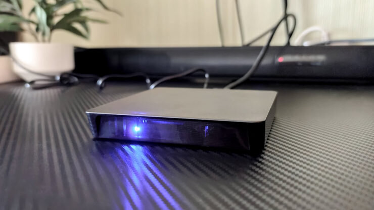 Стоит Media TV i4 PRO на четырех ножках. Прорезиненных, но со слабым сцеплением с поверхностью. Очень компактный и легкий, девайс будет уместно смотреться в современном интерьере, а если нет – легко затеряется на полках стоек под ТВ.