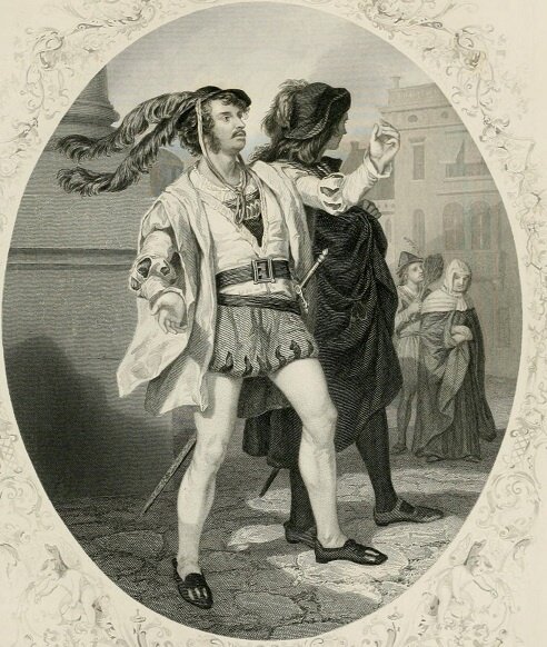 Указание в начале акта гласит: «Входят Самсон и Грегорио, слуги Капулетти, с мечами и щитами». Зрителям пока не известно, что эти двое принадлежат к дому Капулетти, но по их одежде можно сказать, что они находятся в услужении кого-то знатного. Богачи одевали своих слуг в униформы (ливреи), чтобы произвести впечатление. Примерно с той же целью современные нам уличные банды одеваются каждая на свой манер. Также важно, что Самсон и Грегорио вооружены мечами и щитами. Мечи носила знать, слугам их как правило не давали, а маленькие круглые щиты (баклеры) нужны именно для боя один на один. В общем, по внешнему виду этой пары можно сказать, что они нарываются на неприятности.