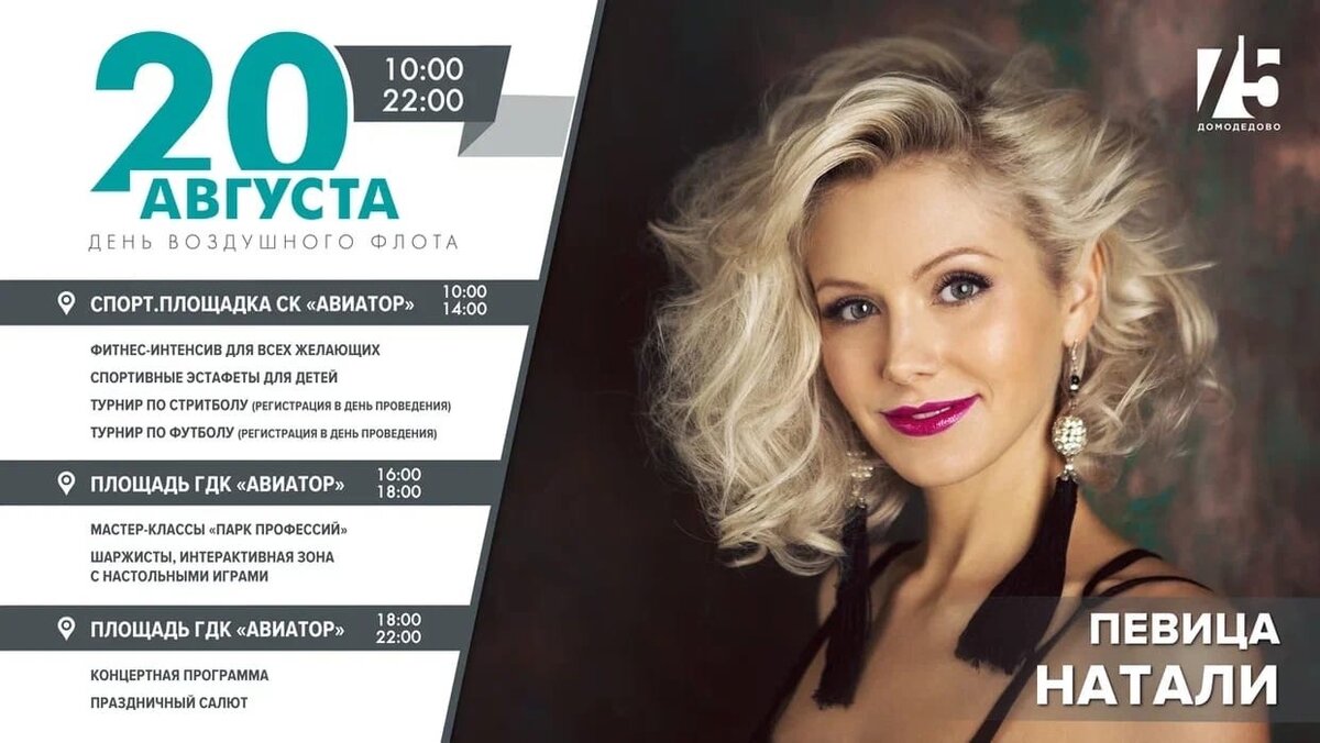 День Воздушного Флота России отметим на площади возле ГДК «Авиатор» 20 августа. Подписывайтесь на новостной канал в Телеграм https://t.me/domodedovolive С 10:00 до 14:00 пройдёт утренняя программа на спортивной площадке СК «Авиатор».