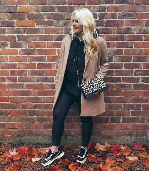 Джоанна (вверху) выбирает сумку через плечо с леопардовым принтом к своим леггинсам.