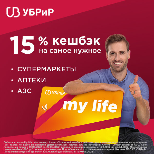 УБРиР Банк - Дебетовая карта "My Life" Заказать дебетовую карту онлайн Акция! С 10.07.2022 стартовала акция для клиентов "Розыгрыш 100% кэшбэка" Как принять участие в розыгрыше? Это просто! Совершайте покупки на сумму от 5 000 рублей и оплачивайте их картой УБРиР. Если у вас ещё нет карты – просто оформите её в два клика. Оплатите любым удобным способом услуги ЖКХ – так вы не только станете участником розыгрыша, но и гарантированно получите кешбэк 5% на карту. Как проходит акция? Сроки акции – с 10 июля по 15 августа 2022 года. 25 августа выберем 30 счастливчиков рандомным способом. Максимальная сумма кешбэка на 1 победителя – 50 000 рублей. Как узнать результаты? Опубликуем на сайте и обязательно свяжемся с каждым победителем. Возвращаем до 5% кэшбэка за ЖКХ и мобильную связь с бесплатной дебетовой картой «My Life» Заказать дебетовую карту онлайн Выдача карты: Способы пополнения: В кассах ПАО КБ «УБРиР» и АО «ВУЗ-банк» Преимущества: Заказать дебетовую карту онлайн
