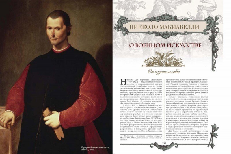 "Государь", в конце концов, как минимум имеет ценность как одна из первых работ на ниве политологии — где можно усмотреть попытку некоего исследования, допустим. Вообще-то и тут не всё так просто, особенно если книгу правда читать (саму, а не краткий пересказ) и понимать контекст эпохи, но про это — как-нибудь в другой раз. А что с "О военном искусстве"?