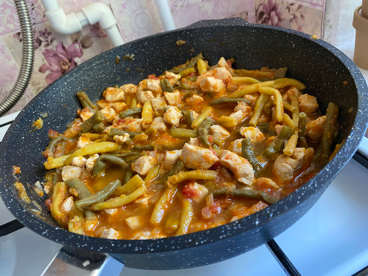 - Обжариваем до полуготовности курицу, потом добавляем нарезанную стручковую фасоль и нарезанный помидор.