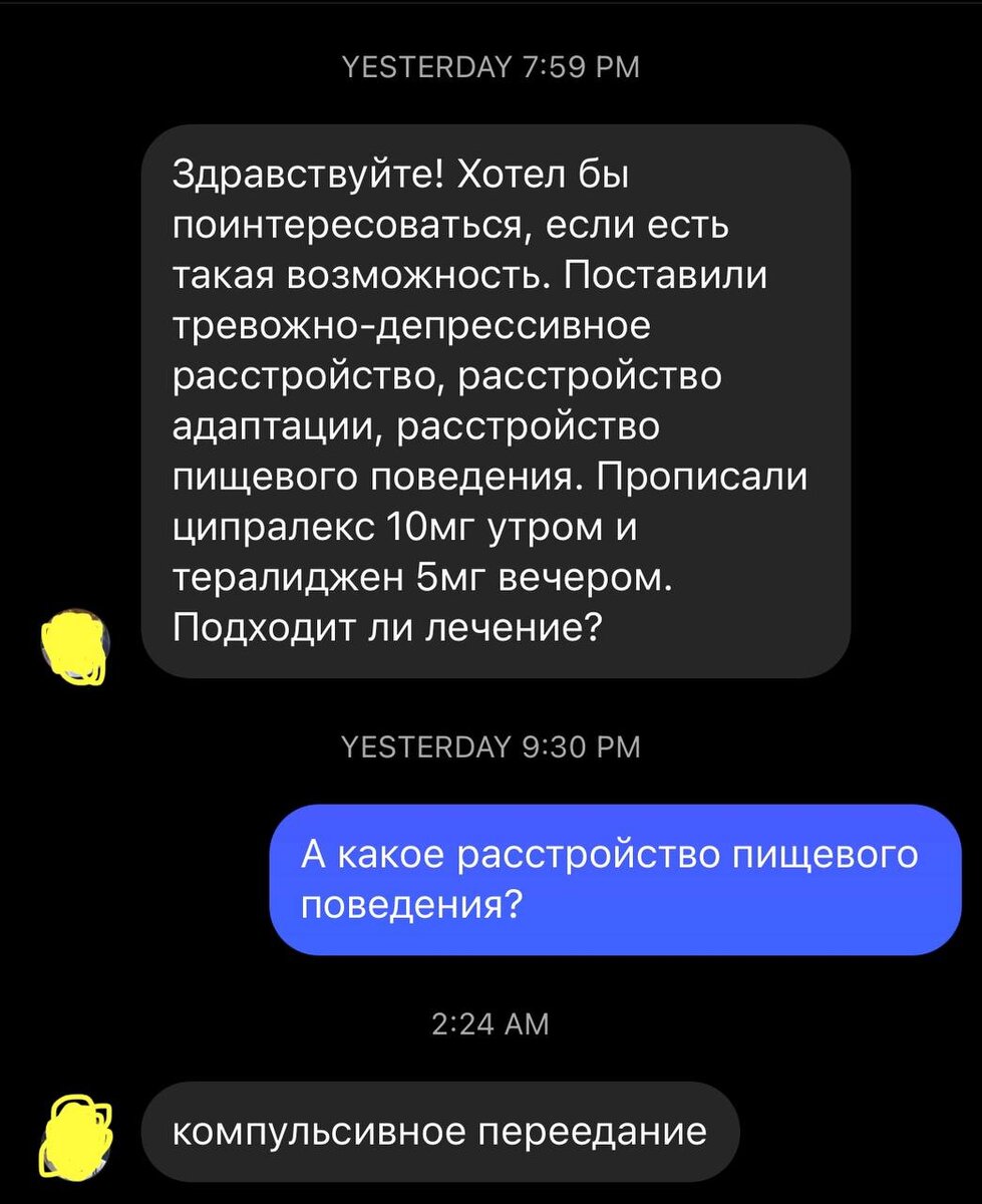 👨🏼⚕️Разбор диагноза и назначений Диагноз: тревожно-депрессивное расстройство, расстройство адаптации, расстройство пищевого поведения (компульсивные переедания) Лечение: ципралекс 10 мг утром, тералиджен 5 мг на ночь Как ни странно, проблема тут скорее в диагнозе, чем в лечении. 1️⃣ Расстройство адаптации - расстрйоство связанное со стрессом, вызванным необходимостью адаптироваться к новым условиям - нерезкое изменение социального статуса, несильное, но продолжительное стрессовое событие в жизни. Бывает нескольких типов: ▪️тревожное ▪️депрессивное (кратковременное и пролонгированное) ▪️смешанное тревожное и депрессивное ▪️с преимущественно другими эмоциями ▪️с нарушением поведения 2️⃣ Тревожно-депрессивное расстройство - в клинической картине есть симптомы тревоги и депрессии, но выражены недостаточно, чтобы поставить отдельный диагноз тревожного или депрессивного расстройства. Стрессовая ситуация, приведшая к расстройству - критерий исключения для ТДР. Соответственно, тревожно-депр