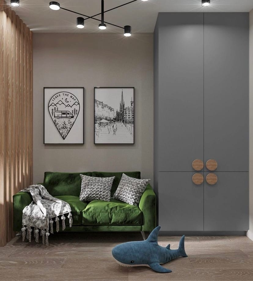 Мы постарались сделать пространство многозадачным и интересным. Делится все на три основные зоны: гостевая, рабочая и спальная. Гостевая часть отделена декоративной перегородкой. Здесь стоит яркий диван, на котором хозяин комнаты сможет расположить своих гостей. За перегородкой личное, уединенное пространство, а у окна небольшая рабочая зона. Так, у старшего ребенка в комнате есть и возможность уединиться и место, где можно провести время с друзьями. А что еще нужно?