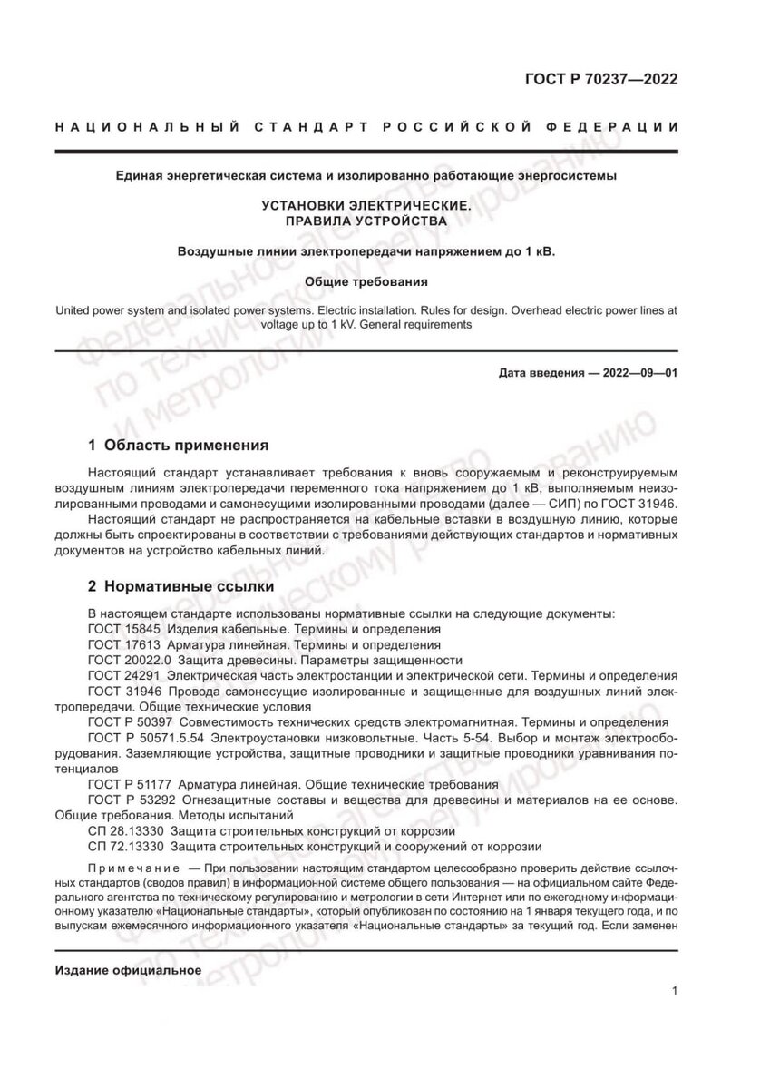 Принят ГОСТ Р 70237-2022 "Единая энергетическая система и изолированно работающие энергосистемы. Установки электрические. Правила устройства. Воздушные линии электропередачи напряжением до 1 кВ. Общие требования" (утвержден приказом Росстандарта от 27 июля 2022 года N 698-ст). - Стандарт устанавливает требования к вновь сооружаемым и реконструируемым воздушным линиям электропередачи переменного тока напряжением до 1 кВ, выполняемым неизолированными проводами и самонесущими изолированными проводами (СИП). Ссылка Каталог ТНД Росстандарта