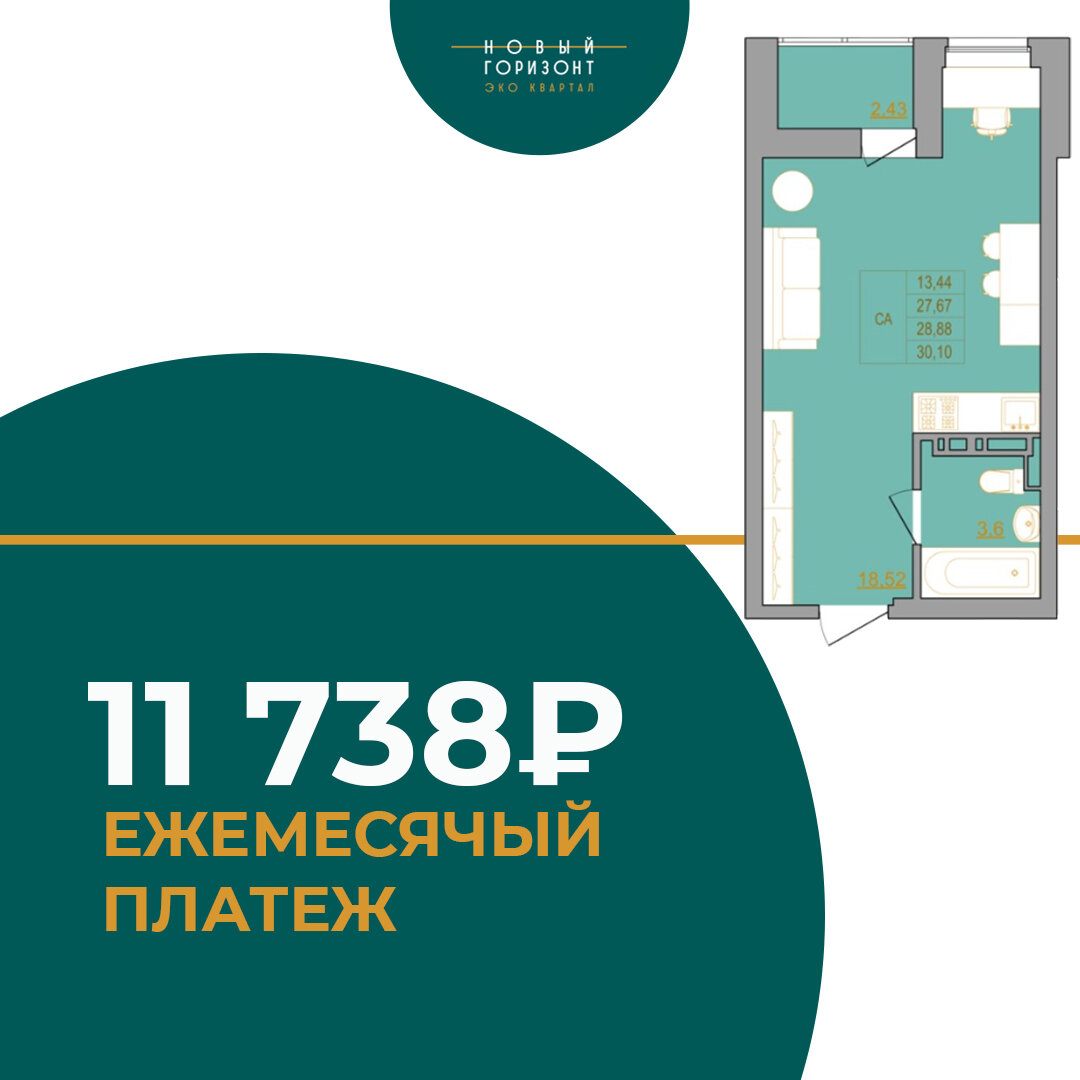 Собственная студия 30 кв. м. в ЖК “Новый Горизонт”: 11 738 Р/мес.