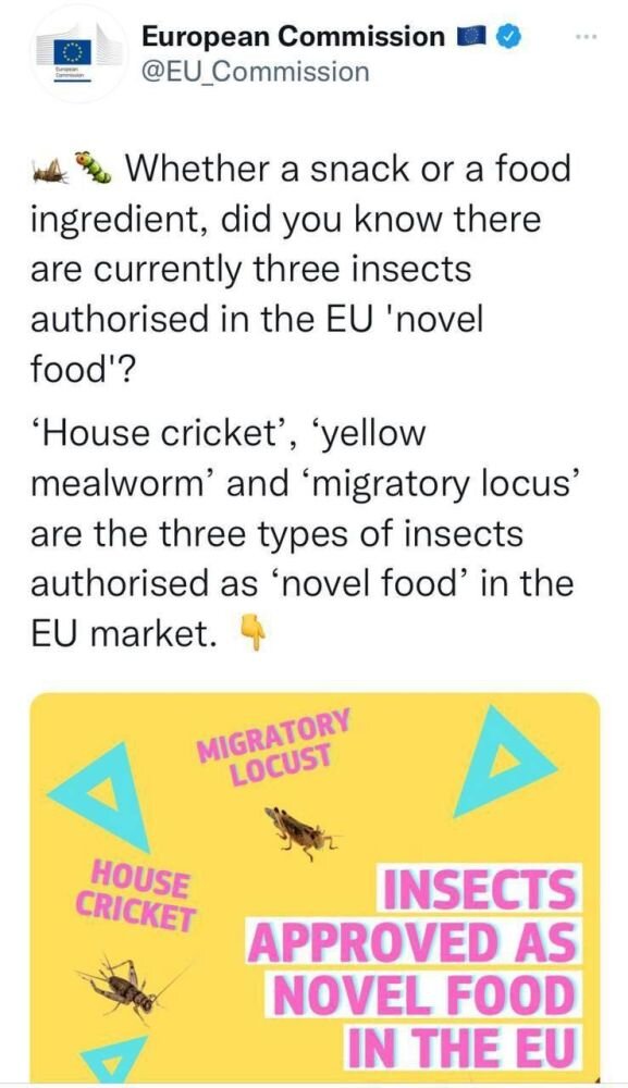 1. Переход на диету из насекомых идёт не только в США и Великобритании, но и в Евросоюзе. Еврокомиссия составила список «новых продуктов» и рекламирует теперь эти «деликатесы» в своём Твиттере (ссылка): Еврокомиссия напоминает европейцам, что есть три вида насекомых в списке разрешённых «новых продуктов» питания.