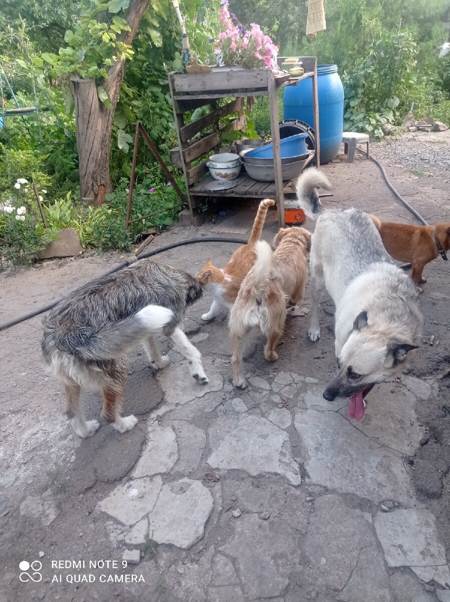 Лето - это жара, сейчас нет воды в сельском мини-приюте Ирины Стрижак, собственно как и везде вокруг. Животных и людей допекают мухи, комары. Но лето прекрасная и красивая пора еще!) Вы только посмотрите на фото хозяйки) Это и фрукты, ягоды, цветы, жаль им не хватает водички... Животным можно побегать, полежать в тенечке, поймать мышку, съесть травку, даже арбузик, и к, сожалению оно идет к исходу, такое жаркое, но прекрасное лето... Кажется и природа и животные, все заняты своими личными делами. Вот кошечка Люся у нас охотница знатная 🐭Добытчица 😁👍👍👍 Как красиво у Ирины, только вот жаль, в этом году из-за жары, мало цветов, да и собачки ломают часто их...((( Фото все шикарные. Справа большое растение, что-то типа ТУИ подметили друзья? И кто это утопает в зелени? Не узнали??) Это и есть туи, у волонтера их четыре, с семечки вырастила, им уже девять лет, а в зелени утопает Бублик))) Что-то он сильно солидно выглядит, прям крутая собак🤪А то, он Мальчика подсиживает, такой послушный