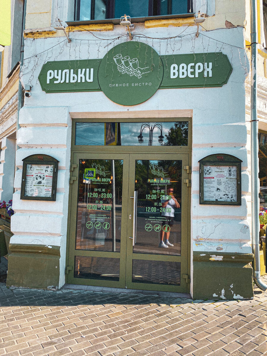 Заведение, которое я отметил для себя перед поездкой называется «Рульки вверх». Заявлено оно как сеть пивного бистро. И действительно, очень колоритное и лаконичное меню уже при прочтении вызвало дикий аппетит! Мой заказ Пройдя сквозь муки выбора, на моем столе вмиг оказались чешский гуляш, корзинка самых разнообразных булочек и темное крафтовое пиво собственного производства! Также в качестве презента принесли ведёрко пшеничного и ржаного хвороста. Свежайшее ароматное пиво тут же утолило жажду, оставив приятное послевкусие слегка жженого ячменя. Ну а гуляш — просто песня! Наваристый мега-мясной суп с овощами очень доброй порции насытил и наполнил силами для продолжения прогулки. Интерьер Наш старый-добрый стиль лофт и пивная тематика неразрывны. Все очень аккуратно и выдержано. Два зала на выбор, где есть столы для больших компаний, пар и любителей высоких барных столов. Терракотово-зелёные оттенки, светлое дерево, металл, не скрытые коммуникации и декорации в стиле ирландских пабов