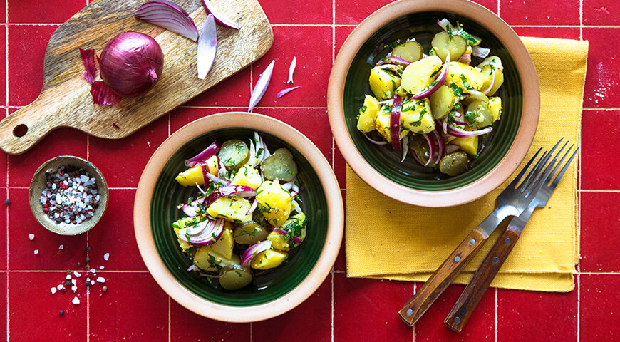 Немецкая традиция поливать картофель для салата заправкой, пока ломтики ещё горячие, очень оправдана – ведь в таком случае картофель почти мгновенно впитывает в себя богатый вкус соуса и вполне бюджетный салат получается совершенно исключительным.