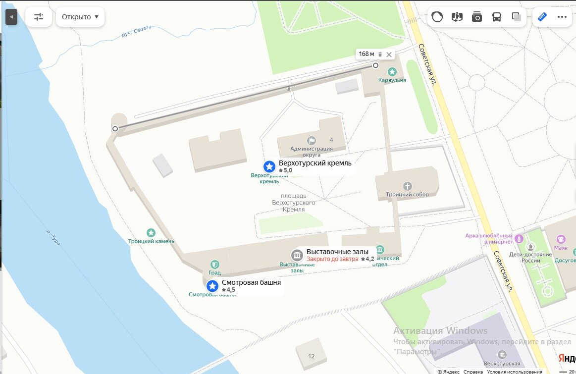 1. Кремль в Зарайске. Все верно, Кремль имеет небольшие размеры, всего 620м протяженности стен. Примерный прямоугольник со сторонами 125*185м (с небольшими погрешностями). Но в России есть и еще меньший Кремль, расположенный в Верхотурье с общей длиной стен около 500м. На фото ниже видно, что длина самой протяженной стены всего 165м: