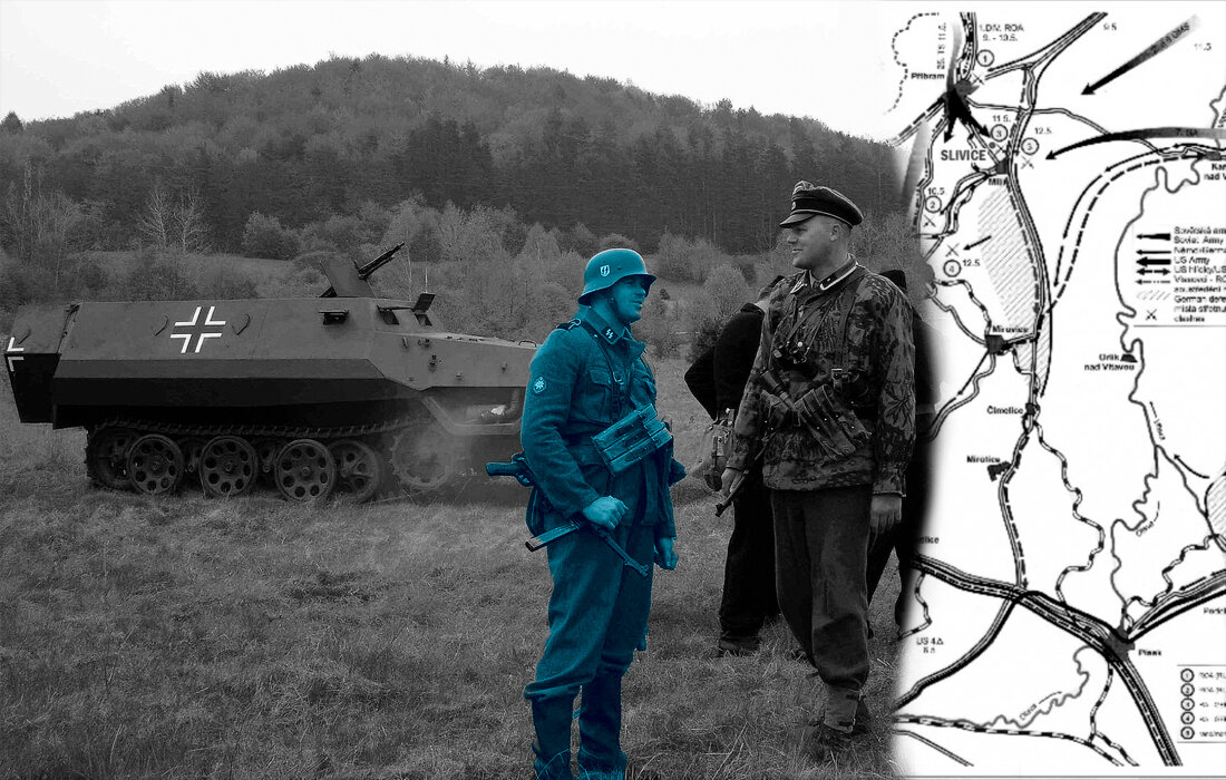 Последним крупным сражением Великой Отечественной войны считается бой у чешского посёлка Сливице, в 60 км к западу от Праги. Бой многочасовой, кровопролитный, с привлечением авиации и артиллерии. 2-й мехкорпус генерала Свиридова, из состава 6-й гвардейской танковой армии, получил приказ атаковать 7-тысячную группировку из частей Ваффен СС, не сложивших оружия и пробивавшихся в сторону американских войск. Командовал этой группировкой группенфюрер Карл-Фридрих Пюклер-Бургхаус – военный преступник, замешанный в организации многочисленных карательных операций в Белоруссии, на Смоленщине и под Псковом. На тот момент он был начальником Управления СС в Богемии и Моравии. Нечего терять. Непримиримые с СССР и рвущиеся к американцам Большинство его подчинённых тоже рвались в плен к американцам не зря: они были уверены в том, что в советском плену их ждёт неминуемая казнь за военные преступления. Даже когда их настигли и частично заблокировали красноармейцы и местные партизаны, гитлеровцы не сдал