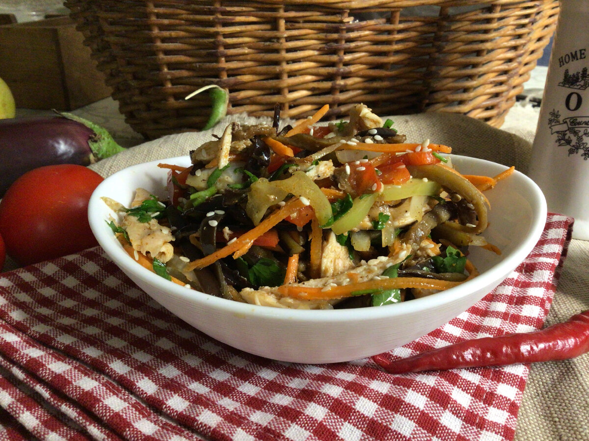 Здравствуйте, дорогие подписчики и гости моего канала. Что- то я давно ничего не готовила из азиатской кухни. Так как мы любим и овощи, и мясо, и острое тоже. Поэтому сегодня решила приготовить баклажаны, а чтобы салат получился посытней, так как у меня одни мужнины в доме, добавила в салат мясо. Салат получился нереально вкусный и красивый. Начнём с нарезки овощей. Баклажаны не чистим, так они при обжарки не развалятся, и в салате будут смотреться отлично. Замачивать в воде тоже не надо. Натираем баклажаны на тёрке для корейской моркови, на крупных лезвиях. Так же соломкой натираем морковь, но на мелких лезвиях. Ножом нарезаем сладкий перец. Для контраста цвета я взяла два вида перца, красный и желтый. Крупной соломкой нарезаем отварное филе курицы. Ножом мелко нарезаем петрушку. Измельчаем чеснок. Приготовим специи: перец Чили, специи для корейской моркови, чёрный молотый перец, прованские травы. Все овощи нарезали, специи приготовили будем готовить. Баклажаны обжариваем