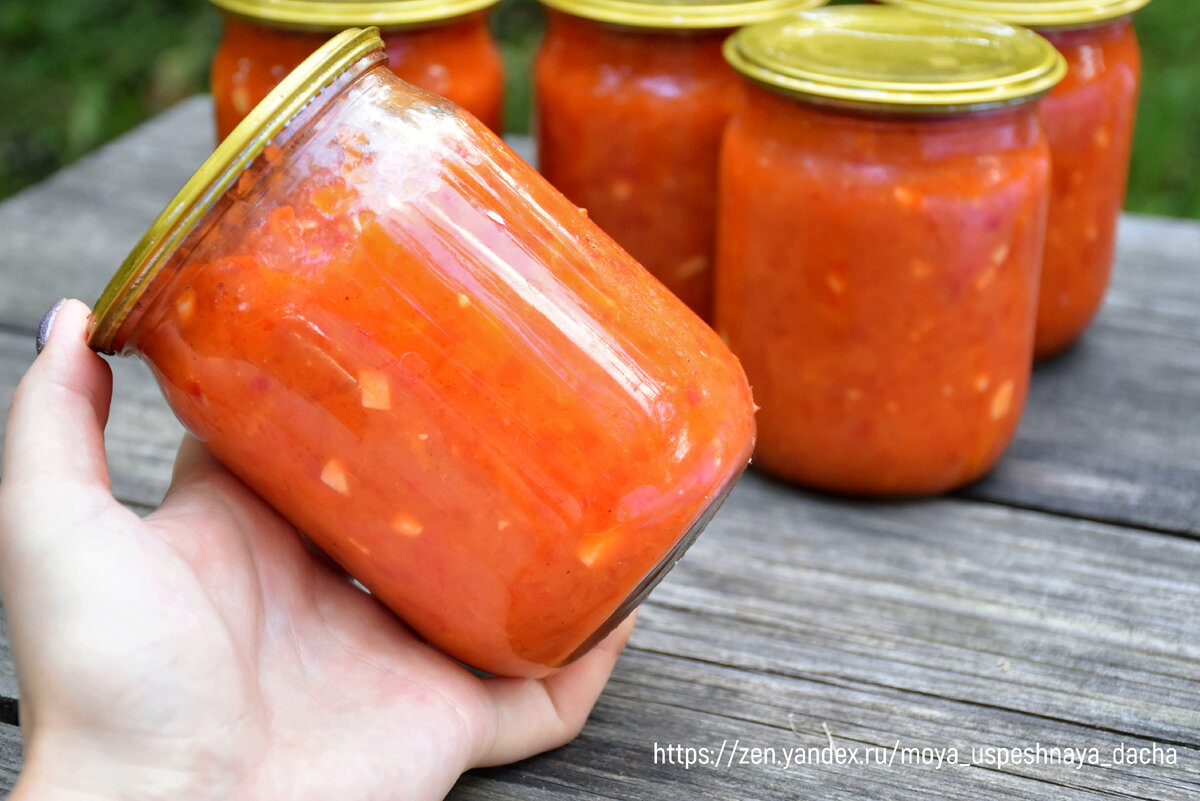 ✅ 4. Горячую заготовку разлейте по стерильным банкам и закатайте. Из данного количества ингредиентов получается 20 баночек по 0,5 литров. Я обычно готовлю две партии, чтобы на зиму вышло 40 баночек. Данного количества нам хватает на всю зиму. Это с учетом того, что моя кладовка забита и другими заготовками.