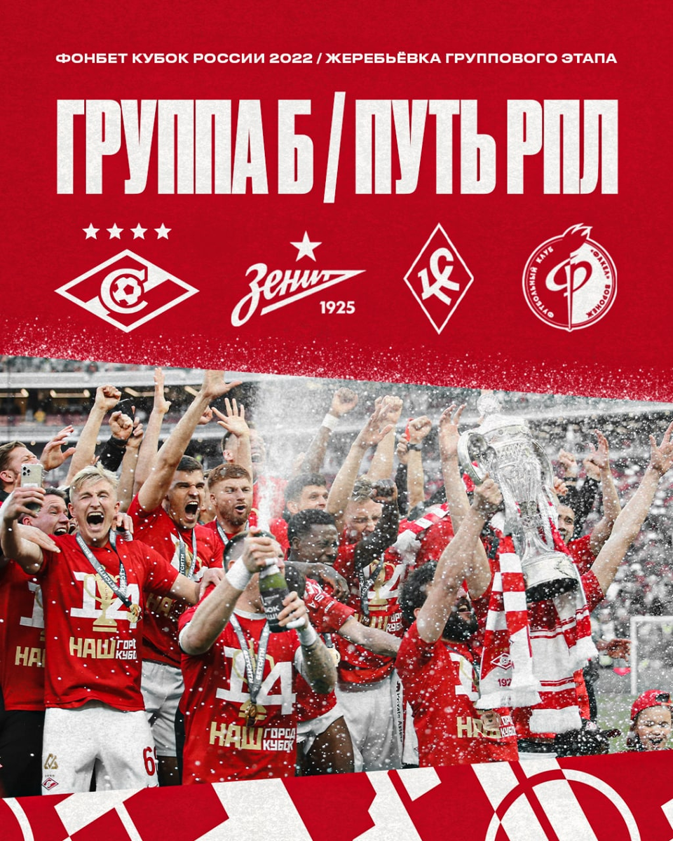 Всем привет! Сегодня прошла жеребьевка Кубка России по футболу, вернее группового этапа пути РПЛ, в группу со Спартаком попали: Зенит, Крылья Советов и Факел. Как по мне - "группа смерти", ни больше ни меньше)) Факел, как по мне - самая злая команда из четвертой корзины, Крылья - может и не самая сильная из своей, но точно самая играющая и готовая дать бой любому сопернику и Зенит, пока еще действующий чемпион и самый дорогой и укомплектованный по составу клуб РПЛ. Тем интересней будет смотреть турнир, поупражняться в битвах с Зенитом и научиться играть против андердогов в матчах с Факелом. С Самарой - уверен, как минимум будет красивый футбол. Ну, а для болельщиков "пробивающих" выездные матчи - просто рай, все города команд соперников достойны посещения, а в Самаре и Воронеже, вероятен перевес КБ на трибунах и крутейшая атмосфера. Кстати, если я правильно помню и понял регламент из группы выйдет три команды, так что "топы" не вылетят на начальной стадии турнира, как это бывало рань