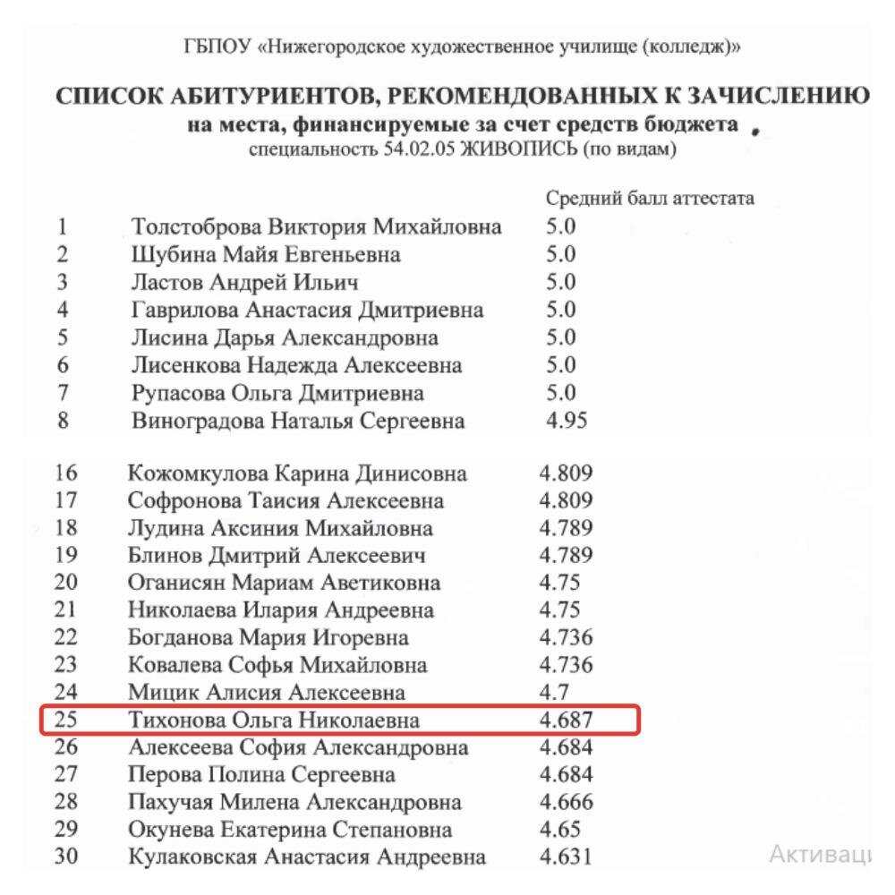 На бюджет прошла и «демонстративная девочка» – та самая, что со «слабым рисованием». У неё по специальности на десять баллов ниже (всего 15), чем у той, которой нет ни в одном списке. Но она всё же поступила, несмотря на самые низкие (из допустимых) баллы – школьная отличница.