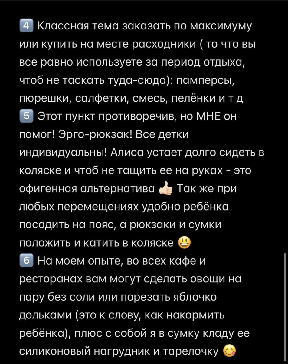 Это конечно ооочень отличается от самостоятельного путешествия 🙈 Начиная со сбора чемоданов 😬 Когда ты путешествуешь один - закинул плавки, шлепки и вперёд … а тут … нужно продумывать наперёд кучу сценариев, начиная от прокручивания каждодневной рутины: покушать, переодеть, посадить на горшок, переодеть, искупать, уложить (чтоб была возможность это все реализовывать) 🔴 И максимального предвидения «внештатных» ситуаций: а вдруг похолодает, а вдруг потеплеет, а что может пригодиться если окунуться в активный отдых, а как организовать перелёт, а как организовать длительные прогулки и т д 🙈 Сейчас я могу сказать уже одно - я взяла слишком много лишней одежды для малышки 😅 Давайте покажу вам свои находки, для внештатных ситуаций и налаживания каждодневного режима в новых условиях 👌🏻 (Листай Карусель⏩⏩⏩) 1️⃣ В самолете: - заранее узнайте о возможности дойти с коляской прямо до борта ВС (это возможно в 90%) это оч удобно, если не ребёнка везти, то вещи 😅 - закажите заранее люл