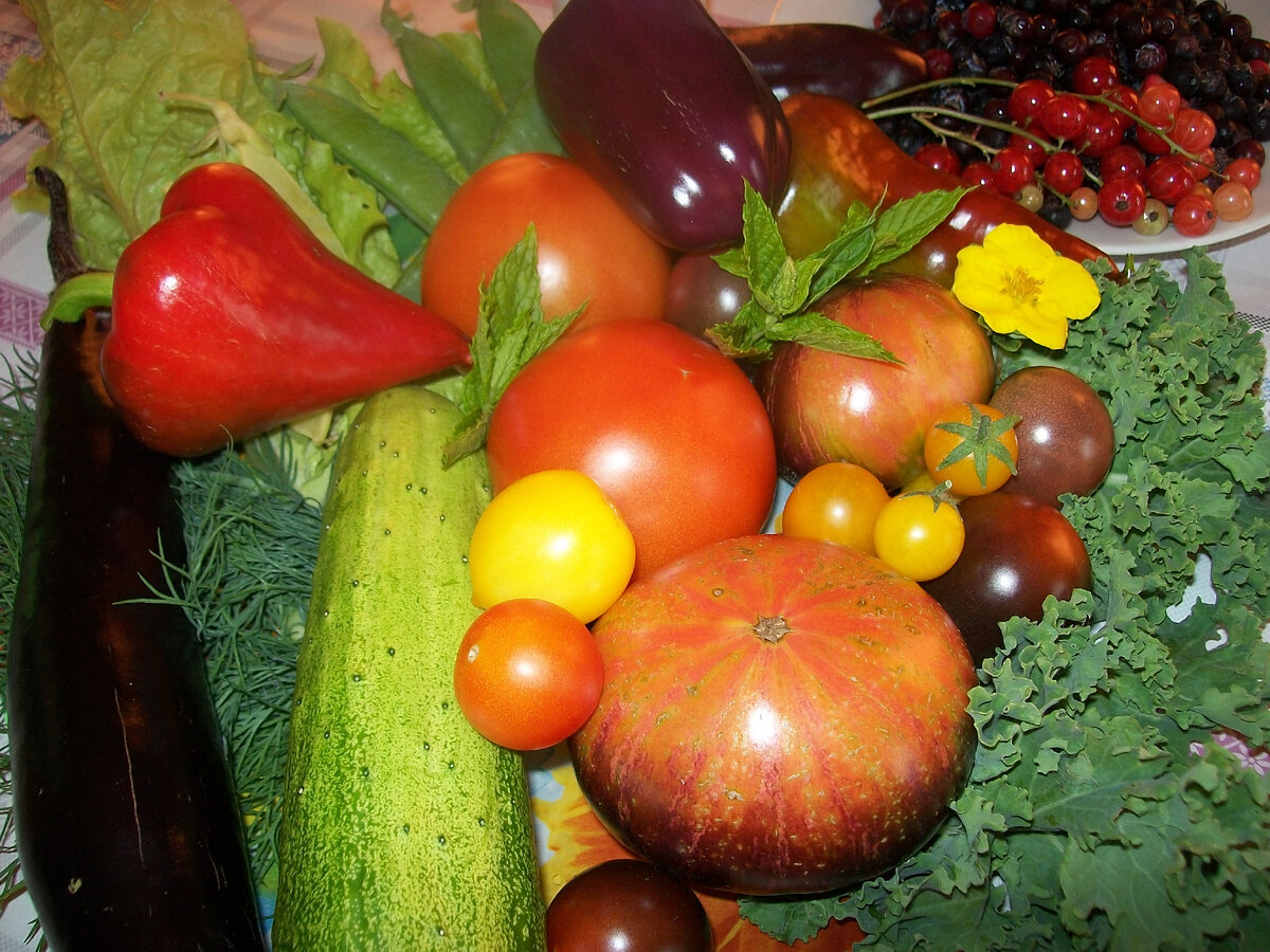 Фотографируете свои овощи? Сегодня я - художник, рисую натюрморты. Радуюсь урожаю, любуюсь разноцветностями. И обязательно делюсь с вами яркой, сочной палитрой. Какой же овощ краше? Выбрать невозможно, да и не нужно. В каждом есть своё природное очарование. У нас всегда выращивается большое разнообразие сортов и видов овощей. Полезно, вкусно и интересно. Сегодня мы создаём своё настроение на долгие зимние вечера. Фотографии перелистаешь и так на душе тепло и солнечно становится..Красота! Выращено с любовью. Обязательно пряные травы. Например, базилик. Вы помните, мы любим ароматы лета...))) Кабачки, патиссоны...какие формы, какие цвета. Между прочем, жёлтенькие кабачки с зелёной макушкой, особо нежные и приятные. Горошки ведь тоже разные бывают. Фиолетовые, жёлтые, зелёные... Невероятно красивые. А на вкус? Вкус из детства, сладкий. Томатная эстетика. Выбирали лидера из уже созревших. Победил зеленоплодный сорт Киви. Нас окружает красота, все творения природы уникальны. Смотр