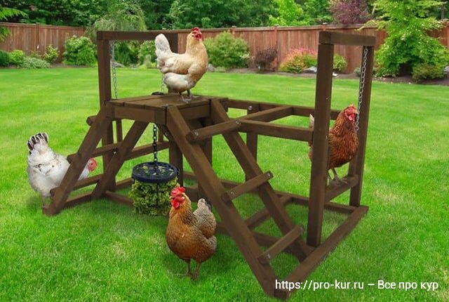 Добрый день. Задумывались ли вы об эмоциональных или интеллектуальных аспектах жизни ваших птиц? Мы уже убедились, что у кур есть чувства и даже эмпатия. Они интеллектуальные создания. Предлагаю смастерить игрушки для кур и цыплят, чтобы они не скучали. А особенно им тоскливо в холодные сезоны топтаться в четырех стенах курятника. Обязательные развлечения курам несушкам Первым развлечением для несушек будет глубокая подстилка. В ней девчата будут копаться, расшвыривать, работая лапками. Ну чем не зарядка? Второй обязательный компонент – это зольно-песочная ванна для чистки перышек. Курочки обожают принимать куриные СПА процедуры. Третий вариант физической нагрузки: укрепить побольше насестов на небольшой высоте, чтобы они по ним прыгали. На высоких насестах пернатые труженицы улягутся на ночевку, а на низких тренажерах будут делать упражнения. Куры несушки, запертые в курятнике и не получающие умственной и физической стимуляции, скорее всего начнут проявлять неадекватное поведение, так
