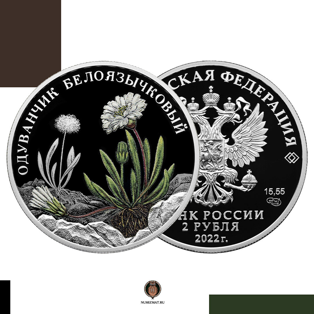 19 июля 2022 Банк России ввел в обращение сразу 3 монеты из серии «Красная книга». Серия является одной из старейших в России – ее начало было положено еще в СССР в 1991 г. двумя биметаллическими монетами номиналом 5 руб. За тридцать с лишним лет монеты неоднократно меняли свой тип и номинал, но с 2008 чеканятся из серебра 925 пробы номиналом 2 рубля. Выпуск 2022 посвящен двум представителям флоры и редкому грибу. Все монеты отчеканены на Санкт-Петербургском монетном дворе в пруфе тиражом всего 5 тыс. экз. Одуванчик белоязычковый Этот вид одуванчика встречается только на территории нашей страны – на Кандалакшском берегу Кольского полуострова, на скалах Турьего мыса. Из-за этого он получил свое второе название: одуванчик турьемысский. От обычного одуванчика он отличается расцветкой: лепестки у него белые и лишь в центре желтеют. Встречается на ограниченном участке длиной всего 100 метров вдоль берега, в трещинах и на уступах скал, в расщелинах и среди обломков камней. Цветет в июне-июле