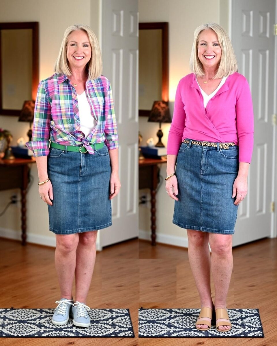 Наверняка в вашем гардеробе есть юбка. И скорее всего, не одна. И, конечно, вы знаете, с чем нужно носить ту или иную модель. А если случилось так, что купленная модель никак не вписывается в гардероб, то посмотрите на следующие образы. Юбка джинсовая Джинсовая юбка – модель универсальная, с ней можно создавать самые разные комплекты. Вот еще два интересных примера. Основа образов – джинсовая юбка покроя карандаш и белая базовая футболка с V-образным вырезом, заправленная за пояс. В первом случае образ дополнили яркой рубашкой в клетку. Рубашка не застегнута, но передние полы завязаны узлом на линии талии. Во втором образ дополнен розовым кардиганом из тонкого трикотажа. Кардиган не застегнут, на запахнут и заправлен за пояс юбки. Оба вариант дополнили неширокими ремнями. Легкая юбка силуэта трапеция Такая юбка – отличный вариант для создания летних образов. Носить её можно с майками, футболками, различными топами. Но и когда жара спадет, отказываться от этой одежды не стоит, нужно про