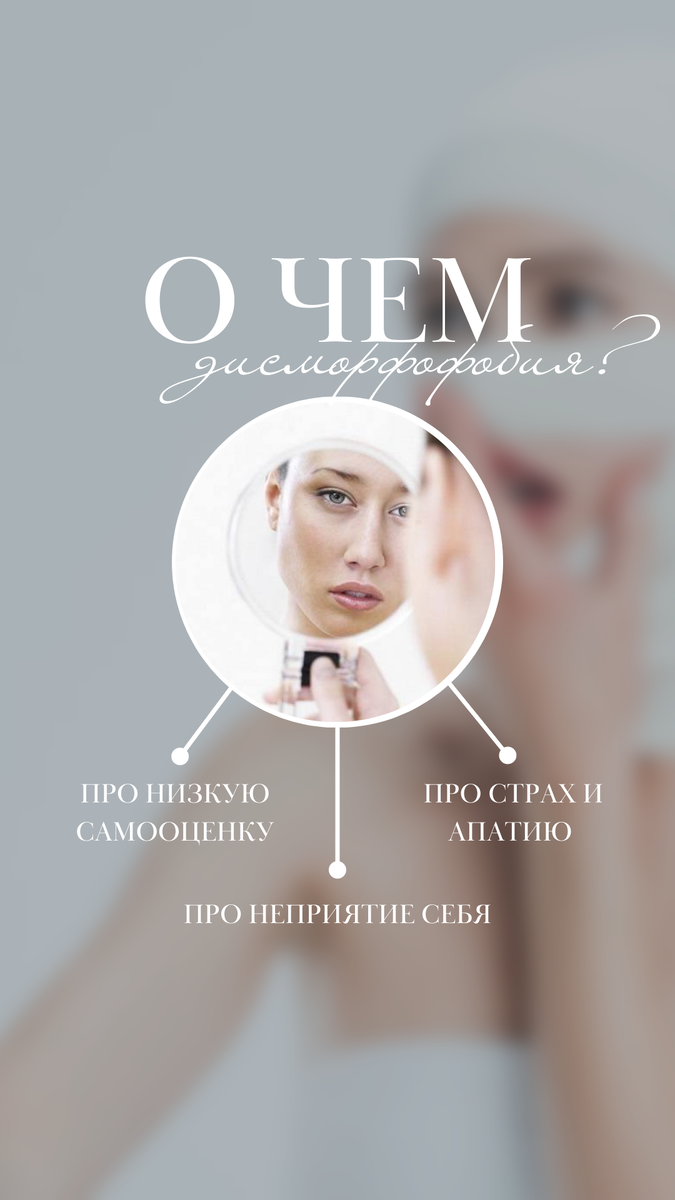 Синдром дисморфофобии – это состояние психики, при котором человек чересчур озабочен своей внешностью, не может адекватно оценивать особенности собственного тела, и делает все для исправления надуманных недостатков. При расстройстве мужчины и женщины начинают увлекаться пластической хирургией и диетами. Дисморфофобия является психиатрическим расстройством, и характеризуется она чрезмерной фиксацией на мнимый дефект во внешнем виде. Хотя это психическое заболевание, большинство людей не признают его и обращаются за помощью к хирургам и дерматологам. Пациенты с дисморфофобией могут испытывать беспокойство в любой части своего тела: губы, щёки, нос, руки, живот, волосы - что угодно. Также многие беспокоятся о морщинах, прыщах, больших или маленьких родинках в большом количестве. В чём причины возникновения дисморфофобии и кто ей подвержен? Причина дисморфофобии точно неизвестна, но не так давно прочитав в интернете возможные факторы её развития, я обнаружила вот что: биологические – нар