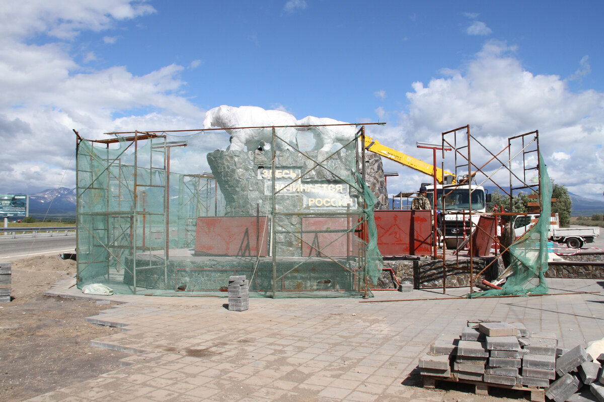 Умка и Большая белая медведица? Ан нет, показалось, это же наши новые бурые мишки прилетели! Белые они лишь из-за того, что с них ещё не сняли защитный материал. Но уже сейчас их фигуры, только-только установленные на постамент, гордо смотрят на Елизово. Выглядят новые искусственные хищники так же, как и прежние, но сделаны из прочного и долговечного материала. Планируется, что реконструкция одной из самых известных на всю Россию камчатских скульптурных композиций завершится к концу недели. В процессе восстановления объекта была произведена замена каменной облицовки пьедестала, установлено новое ограждение, а также новые статуи медведицы и медвежонка. Косолапые были изготовлены в городе Москве. Причина замены архитектурных форм, как и полной реставрации композиции, кроется в частичном разрушении объекта, связанном с многочисленными посягательствами вандалов и небрежным отношением к объекту многих из его посетителей. Восстановительные работы визитной карточки всего Камчатского края обой