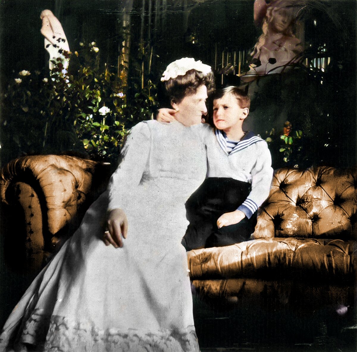 Александровский дворец был домом для семьи Николая 2, а с 1904 годом по сути постоянным местом жительства (до этого у них была обустроена квартира в Зимнем дворце, которая после была законсервирована и редко использовалась). Все фотографии ниже сделаны в Кленовой гостиной, это один из самых красивых интерьеров дворца. Посмотрите на это премилое фото мамы с сыном, Алексей так нежно обнимает свою маму. Цесаревичу Алексею здесь совсем мало лет, а как резко постарела Императрица Александра Федоровна, здесь ей должно быть около 40. А это фотография сделана на том же диванчике, только уже без Императрицы. На фотографии Великие княжны Мария Ольга, Анастасия, Татьяна, Цесаревич Алексей и их отец Во всех комнатах дворца было много как живых, так и срезанных цветов, как например вот эта "клумба" рядом с девочками. На фотографии Великие княжны Ольга, Татьяна и Мария. Следующая фотография сделана почетче, и на ней все те же лица: Великая княжна Татьяна, сидит на кресле Великая княжна Ольга, а рядо