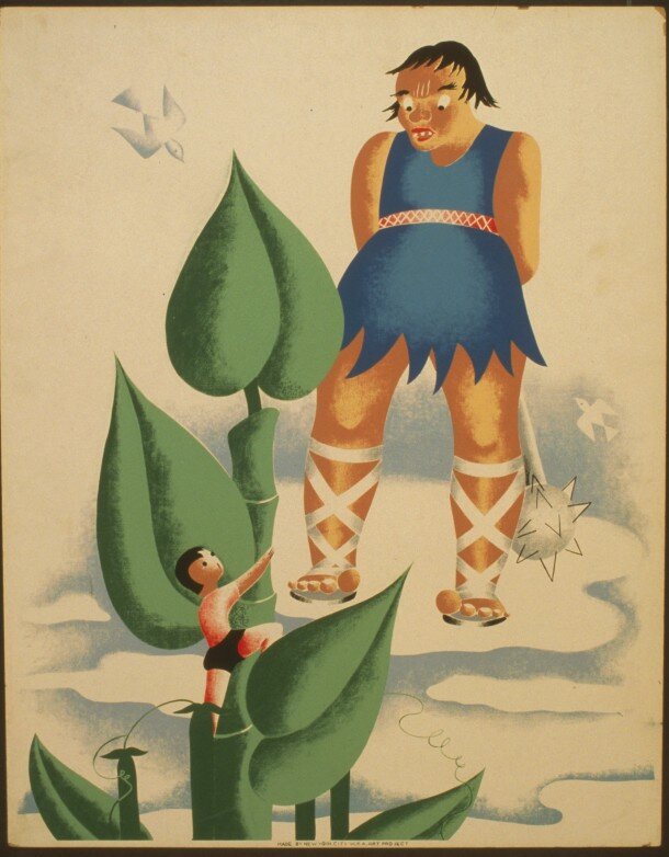 Предыдущая часть Но Джек всё не мог найти себе покоя, он всё думал о приключениях в доме людоеда, пока вскоре не решил еще испытать удачу на вершине бобового стебля. Итак, в одно прекрасное утро он встал рано с зарею и пошел к бобовому стеблю. Лез он и лез, и лез, и лез, пока не добрался до вершины. Но на этот раз он знал, что лучше не заходить прямо в дом людоеда. Подойдя к нему, он спрятался за кустом, пока не увидел, как жена людоеда вышла из дома с ведром за водой, а потом прокрался в дом и забрался в котел. Не сидел он там долго, как вскорости он услышал удары! бух! бух! бух! Пришёл людоед, а за ним его жена. -- Фи-фи-фо-фум, я чую дух англичанина, — воскликнул людоед. — Я чую его, жена, чую его! — Да что ты, мой дорогой? — говорит ему жена людоеда. «Может быть это тот маленький мошенник, который украл твоё золото и курицу, несущую золотые яйца, если так, то наверняка негодяй забрался в печь». И оба они бросились к печи. Но Джека, к счастью, в печи не оказалось, и жена людоеда г