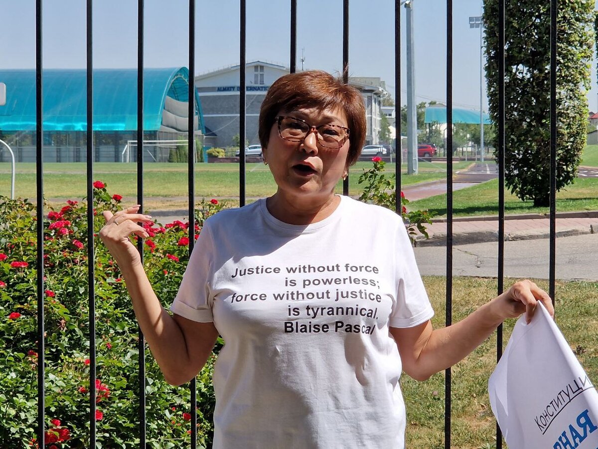 С Жаныл Омаровой расторгли контракт после 30 лет работы в алматинской международной школе. Сегодня она проводит одиночный пикет около её ворот.