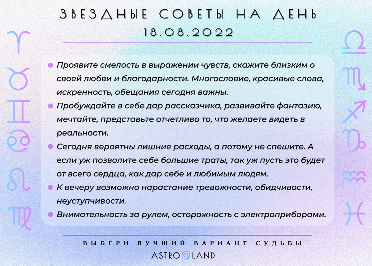 Овен Вас может коснуться сильное желание потратить много и потратить на себя. Вы к этому готовы и хорошо понимаете, что после Вас ожидает период экономии. Телец Потребуются большие усилия на работе. Возможно общение с конкурентами и отстаивание своих прав. Ситуация заставляет бороться за свои интересы. Близнецы Кажется, что ничего не происходит и наступил период неопределенности и сомнений. Завтра все изменится, и Вы вновь будете активны и оптимистичны. Рак Возможно ощущение обнуления, пустоты и не очень желанных Вами обновлений и перемен. Без сожалений принимайте это как очищение. Это необходимо Вам. Обратитесь за помощью к друзьям. Лев Возможна смена планов и неожиданных событий, пересмотр договоренностей. Возможны вести с работы, разговор с начальником. Обстоятельства предложат Вам взять дополнительную нагрузку. Дева День добрых вестей и помощи издалека. Путешествия и темы экзотики, дальних странствий, чужих обычаев. Удачные переговоры с иностранными партнерами. Весы Внутреннее на