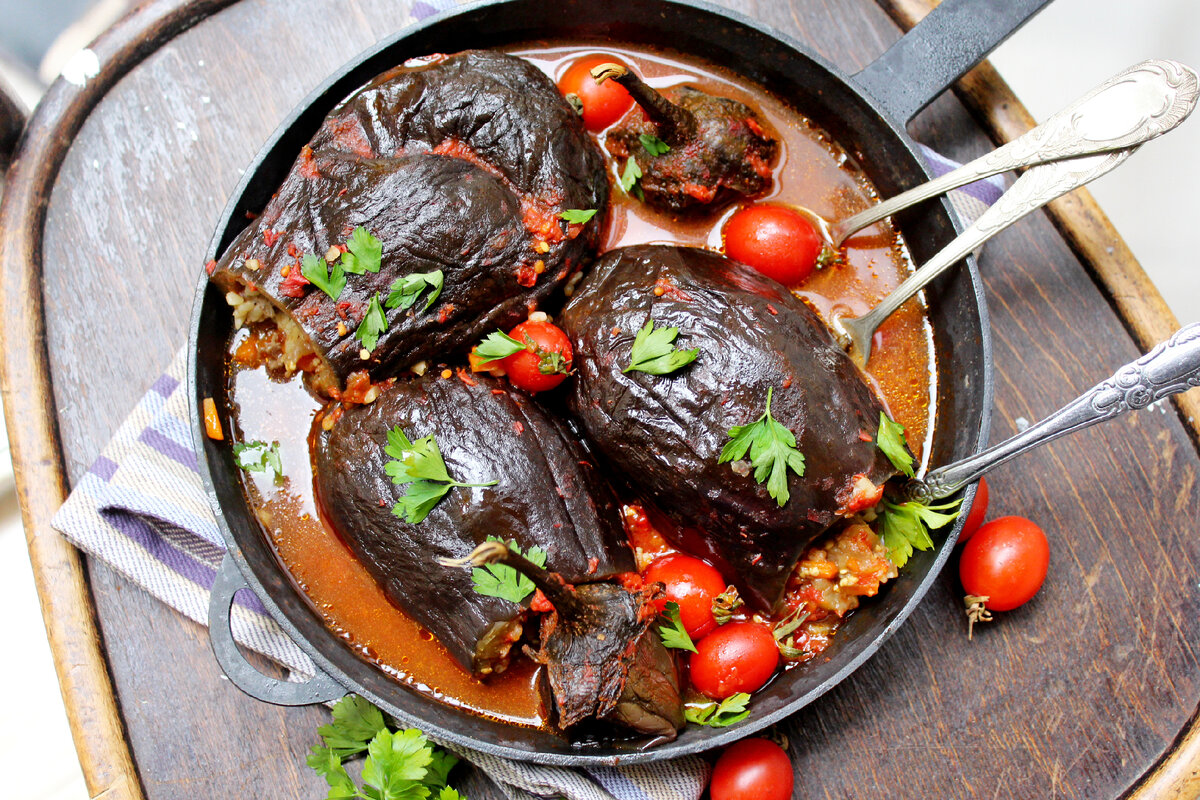 500 мл томатного соуса 2 сладких перца Соль, перец Баклажаны промыть, срезать со стороны плодоножки 3-4 см. При помощи специального ножа (нуазетки) аккуратно вынуть мякоть, не повредив при этом стенки баклажанов. Затем посолить их внутри. В сковороде на растительном масле обжарить мелко нарезанные лук, морковь и чеснок. Добавить мелко порезанную мякоть баклажанов и обжаривать вместе до мягкости Далее положить фарш, посолить и поперчить. Продолжать обжаривать, помешивая, в течение 3-4 минут. Далее всыпать в начинку б