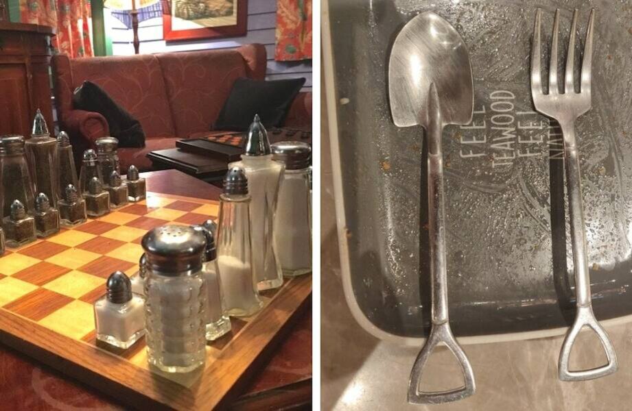 Человек-паук на крыше ресторана, шахматная партия перца против соли, кафе над средневековым колодцем и многие другие странности, которыми поделились гурманы в Сети. Каким вы представляете себе ресторан мечты? Кто-то в первую очередь думает о качестве подаваемых в ресторане блюд, а кто-то сначала представляет дизайн интерьера. В хорошем ресторане или кафе должно быть хорошо все: и блюда, и их подача, и обстановка в целом. Предлагаем вашему вниманию 10 случаев, когда владельцам ресторанов удалось удивить посетителей креативными деталями в интерьере или в подаче блюд. Не каждый ресторан может похвастаться Человеком-пауком на крыше. Соль долгое время выясняла с перцем отношения. Они сражались за место на столе и решили, что честно будет решить проблему шахматной партией. В этом ресторане ложка напоминает лопату, а вилка — вилы. К кофе в этом кафе подают не простые сливки, а сливки в шоколадной емкости, которую можно съесть. Такую табличку ставят на стол те посетители кафе, которые не проти