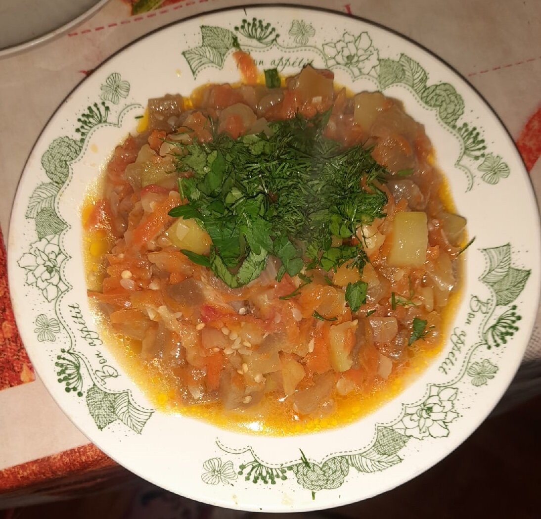 За время, пока нарезали все овощи, меняли воду у баклажанов 2 раза, чтобы вышла вся горечь. Наливаем в казан подсолнечное масло и пассируем в нём лук и морковь. Следом опускаем болгарский перец и помидор. Как лук станет полупрозрачным, добавляем кабачок и баклажан. Наливаем воды столько, чтобы её не было много, а только закрыла овощи.