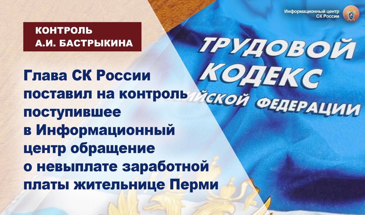 Глава СК России поставил на контроль поступившее в Информационный центр обращение о невыплате заработной платы жительнице Перми