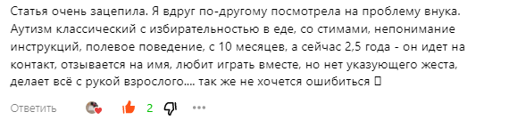 Здравствуй, читатель. Сегодня хочу поговорить об указательном жесте. На сегодняшний момент из всех моих учеников, примерно у 90%, на момент начала коррекции, не был сформирован указательный жест. При этом нарушения у деток могли быть абсолютно разные, как и возраст, как и стартовые возможности. Почему же так происходит. И вот одна из читательниц, снова подняла этот вопрос: у ребенка не сформирован указательный жест (фото комментария ниже), а, как вы знаете, очень часто данный симптом выступает как красный флажок при диагнозе РАС. Но, сегодня я хочу рассказать о том, почему может быть не сформирован указательный жест? И я буду говорить далеко не про РАС... Но начнем с того, что указательный жесть - это жест, который используется для фиксации собственного внимания и фиксации внимания собеседника на определенном объекте. В норме указательный жест формируется примерно к году. Бывает так, что указательный жест не формируется и, конечно, это повод задуматься. Хотя не все родители обращают