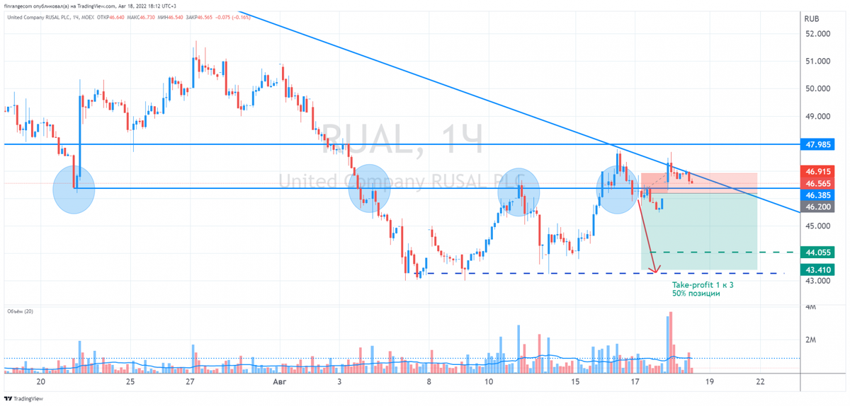Вчера перед закрытием торгов появилась новость о «возможных дивидендах» Русала. 29 августа 2022 г. компания планирует провести заседание совета директоров на котором планируется рассмотреть вопрос по дивидендам за I пол. 2022 г. – говорится в сообщении компании, опубликованном на Гонконгской фондовой бирже. При этом данных на сайте «Раскрытия информации» – нет! На фоне этой новости акции открылись сегодня гэпом вверх, в течение первого часа мы закрыли вчерашний шорт Русала по стоп-лоссу. После чего акции выросли более чем на 3%, но к закрытию торгов растеряли рост. Видимо инвесторы не верят в такой сценарий. Напомним, исходи из дивидендной политики компании, Русал направляет на выплату дивидендов 15% от скорректированного показателя EBITDA, включая дивиденды, полученные от Норильского никеля за соответствующий период. Также нужно отметить, что компания не платит дивиденды с 2017 г., сейчас у Русала отрицательный свободный денежный поток и впереди трудности о которых мы писали, когда от